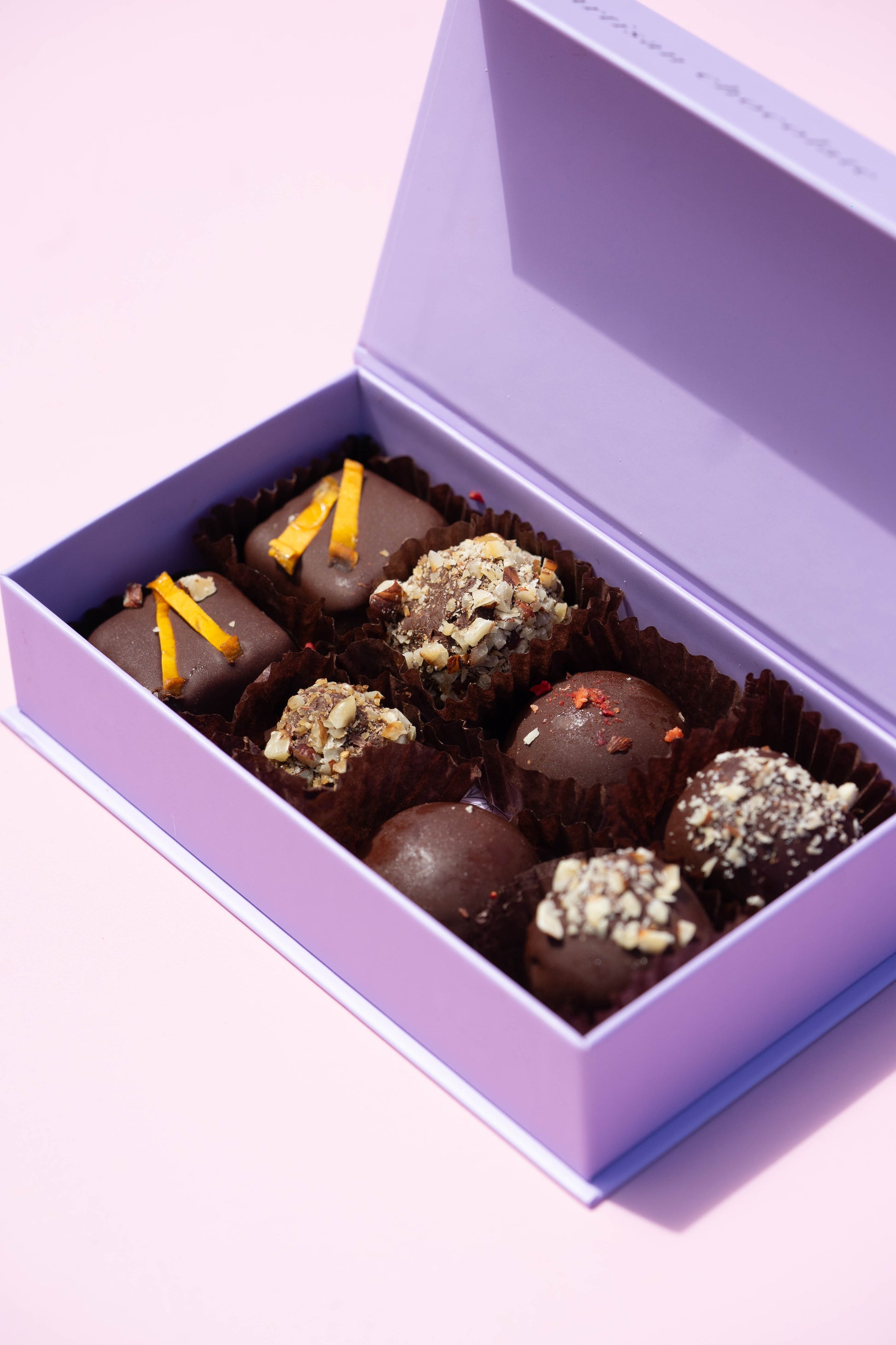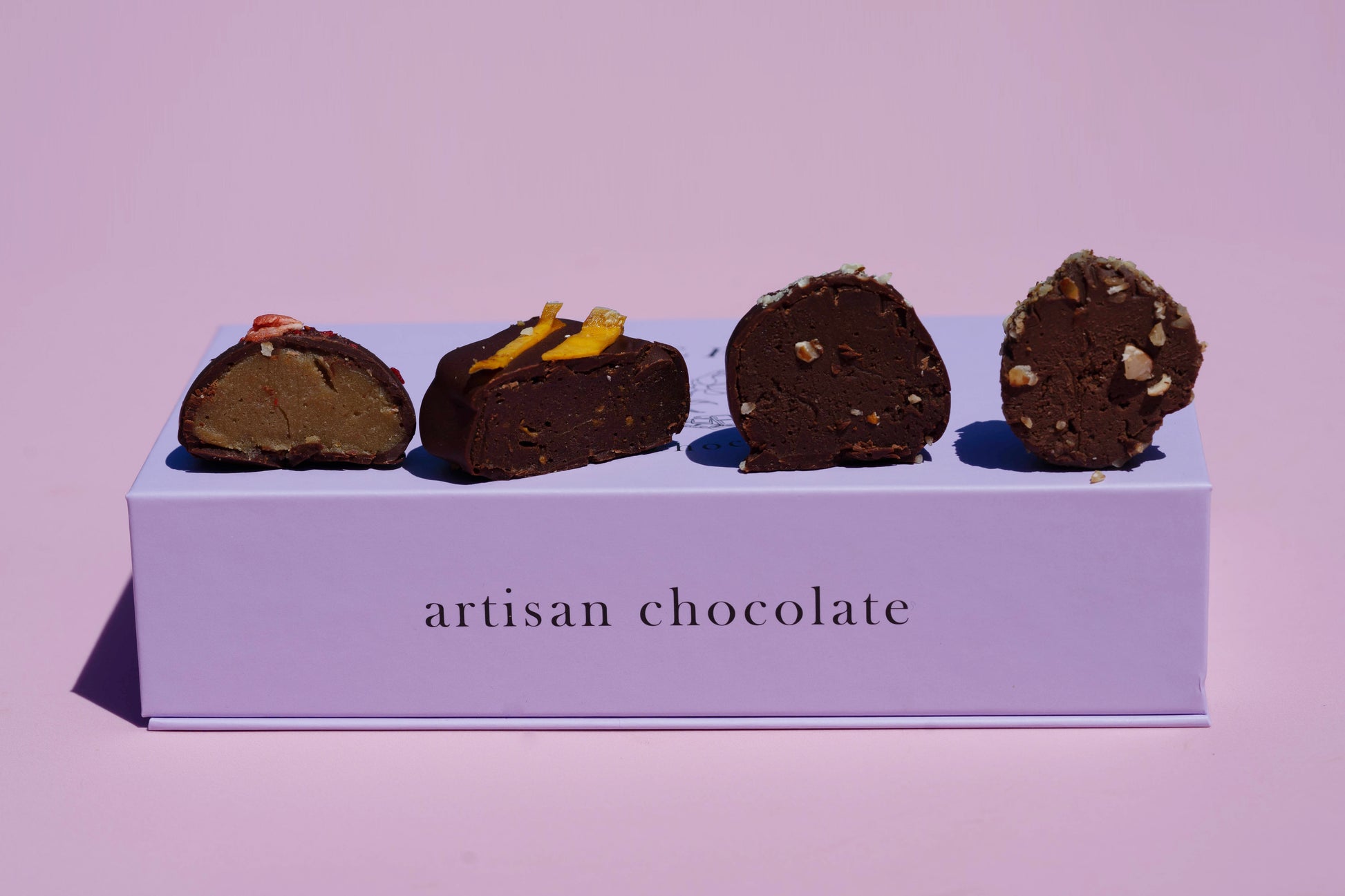 CURRENT SELECTION OF TASTES: 2 HAZELNUT TRUFFLE, 2 MANGO & HAZELNUT TRUFFLE, 2 COCONUT TRUFFLE, 2 SALTED CARAMEL PRALINE.
